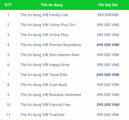 Thẻ tín dụng VIB Super Card có những điều khoản khá hấp dẫn, đặc biệt là về phí hủy thẻ. Nếu bạn quyết định hủy thẻ trong vòng 12 tháng kể từ ngày phát hành, bạn sẽ phải trả phí dao động từ 299.000 đến 599.000 VNĐ, tùy vào loại thẻ. Điều này có thể khiến bạn phải cân nhắc kỹ lưỡng trước khi quyết định phát hành hay ngừng sử dụng thẻ.