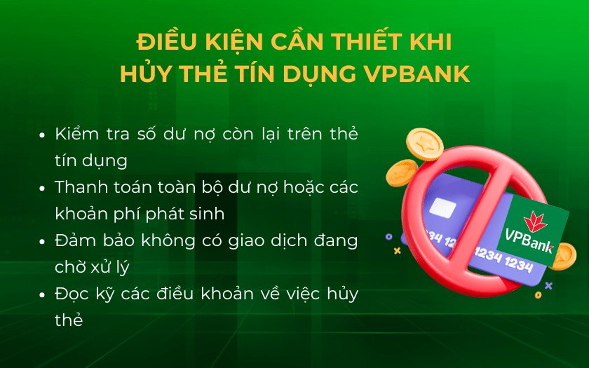 Để hủy thẻ tín dụng VPBank, bạn chỉ cần đảm bảo rằng đã thanh toán hết tất cả các khoản nợ, bao gồm cả gốc, lãi và phí trả góp (nếu có). Ngoài ra, nếu bạn muốn được miễn phí thường niên cho năm đầu tiên, hãy nhớ phát sinh ít nhất một giao dịch từ 300.000 VNĐ. Điều này giúp bạn tối ưu hóa quyền lợi khi sử dụng thẻ.