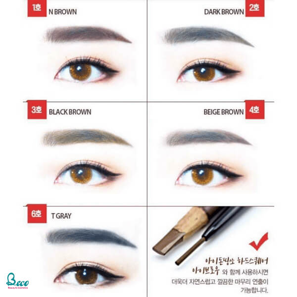 Với bảy màu sắc đa dạng từ nâu tự nhiên, nâu đen đến các sắc thái khác như nâu tây hay nâu rêu, bạn có thể dễ dàng chọn cho mình màu sắc phù hợp với tông da và kiểu trang điểm của mình. Đặc biệt, chì kẻ mày này rất dễ tán và blend màu đều, không bị lem, giúp bạn đạt được hiệu ứng hoàn hảo mà không cần lo lắng.
