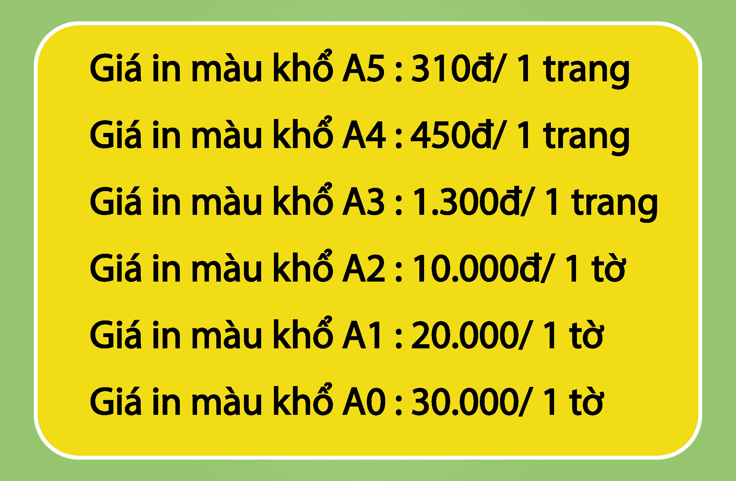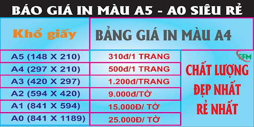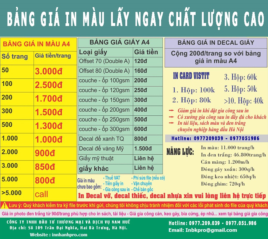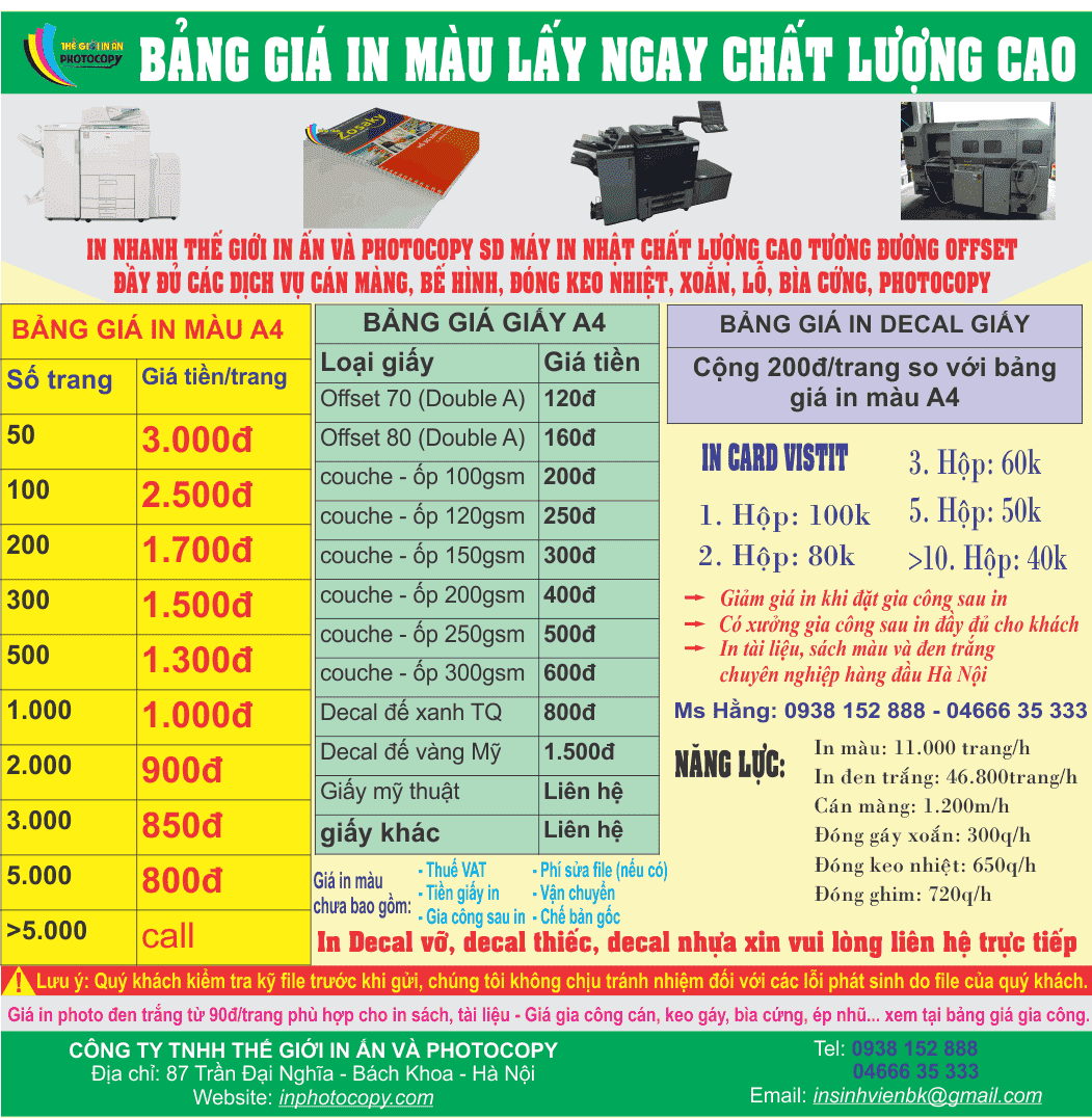 Khi in màu, lưu ý rằng loại giấy và số lượng in sẽ quyết định giá cả cuối cùng. Vì vậy, nếu bạn có nhu cầu in ấn lớn, hãy liên hệ để được báo giá chi tiết và hợp lý nhất.