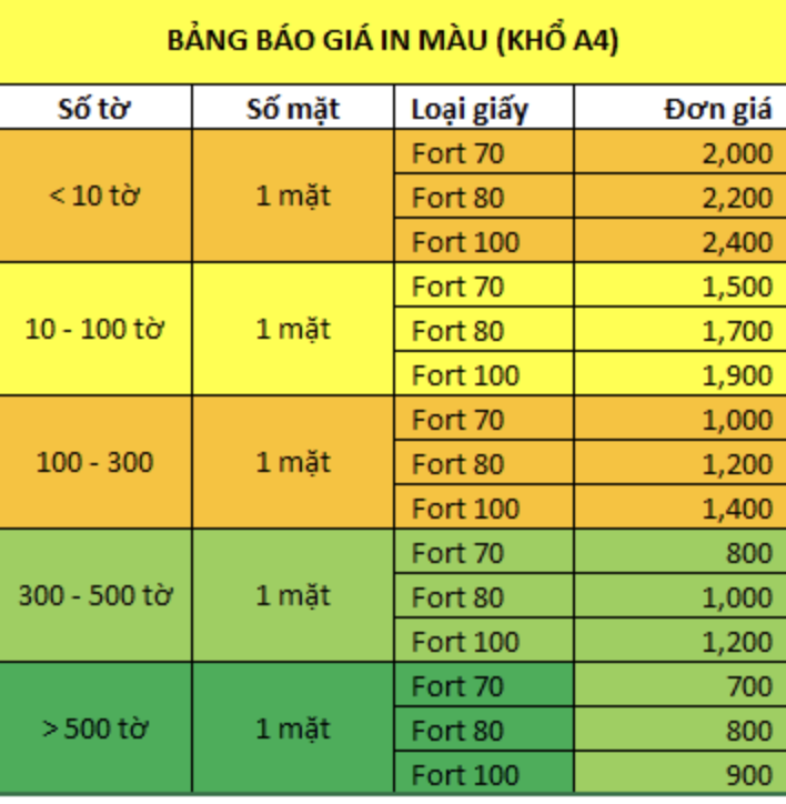 Giá in màu 1 tờ A4 hiện nay khá đa dạng, thường dao động từ 700đ đến 800đ cho mỗi tờ in một mặt. Tuy nhiên, nếu bạn in số lượng lớn từ 100 đến 300 tờ, chi phí có thể tăng lên. Ví dụ, giá in màu trên giấy Fort 70 đạt 1.000đ/tờ, trong khi Fort 80 có giá 1.200đ/tờ.