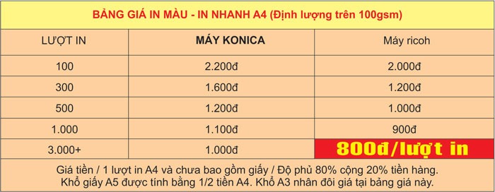 Ngoài ra, giá in màu còn phụ thuộc vào khổ giấy và chất liệu. Thậm chí, đối với những đơn hàng lớn, giá in màu có thể giảm xuống đáng kể, từ 8.500 VNĐ cho 100 tờ xuống chỉ còn 2.800 VNĐ cho 1.000 tờ. Đây là những thông tin rất hữu ích để bạn có thể tiết kiệm chi phí khi in ấn.