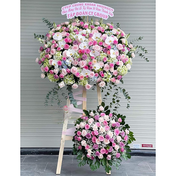 Với sự kết hợp giữa hoa chính như baby xanh, hồng Ohara và hoa phụ như mõm sói hay mokara, từng chi tiết trên kệ hoa được bài trí một cách tinh tế, mang đến một nét đẹp riêng biệt cho buổi lễ trang trọng của bạn. Hãy để những lẵng hoa 2 tầng này làm bừng sáng không gian khai trương của bạn!