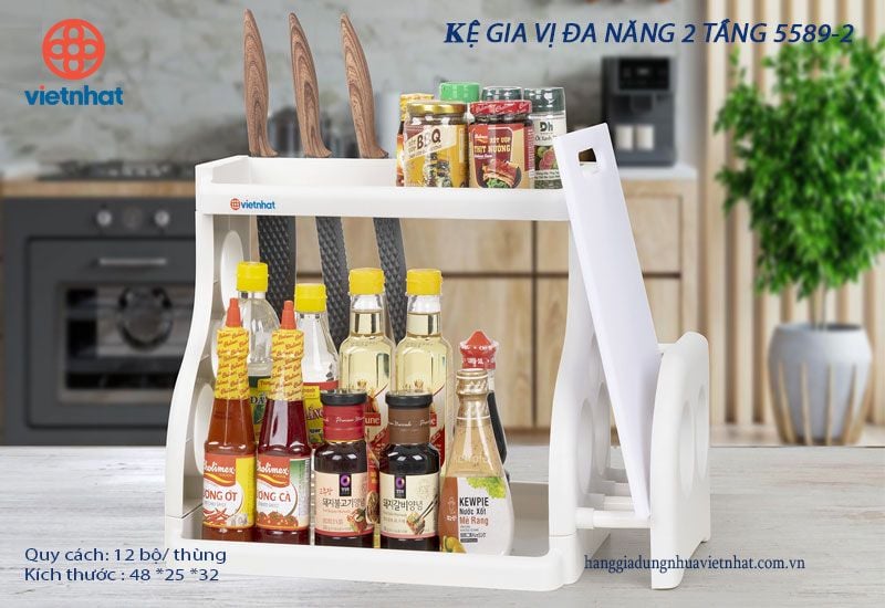 Lắp đặt kệ gia vị đa năng cho nhà bếp không chỉ giúp tổ chức không gian mà còn mang lại sự tiện nghi cho việc nấu nướng. Chiếc kệ hai tầng này còn tích hợp ngăn treo dao và 4 móc để thớt, giúp bạn dễ dàng lấy và sắp xếp gia vị cũng như các dụng cụ cần thiết.