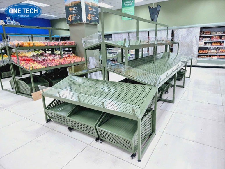 Kệ siêu thị VinMart là một phần không thể thiếu trong việc trưng bày và quảng bá sản phẩm. Với thiết kế hình vuông cùng kích thước tiêu chuẩn, các kệ này không chỉ mang lại sự tiện lợi mà còn giúp khách hàng dễ dàng tìm kiếm hàng hóa. Đặc biệt, kệ rau củ với thiết kế mở và mặt nghiêng giúp cho sản phẩm luôn nổi bật và dễ lấy, tạo cảm giác thoải mái cho người mua sắm.