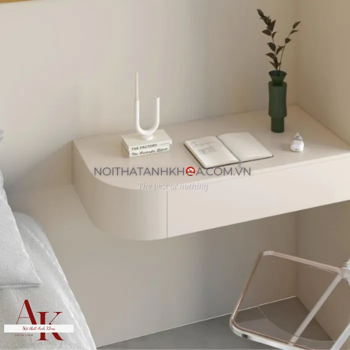 Điểm cộng lớn của kệ là khả năng đa năng. Bạn có thể sử dụng nó như một bàn trang điểm, bàn làm việc hay ngay cả kệ sách. Các mẫu mẫu bàn trang điểm treo tường hiện nay cũng rất đa dạng, từ ngăn kéo tiện lợi đến kệ trang trí sáng tạo. Điều này giúp bạn dễ dàng sắp xếp các đồ dùng cá nhân và tạo ra không gian gọn gàng hơn.