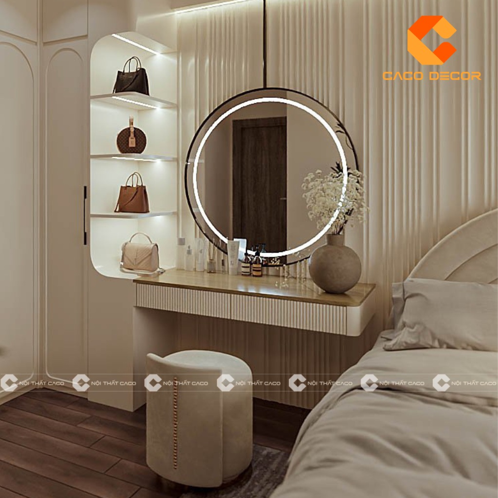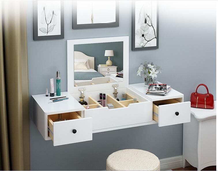 Ngoài việc tiết kiệm không gian, bàn trang điểm treo tường còn được thiết kế hiện đại với các ngăn kéo tiện lợi, giúp bạn sắp xếp mỹ phẩm và phụ kiện một cách gọn gàng. Một số mẫu còn tích hợp đèn LED, mang đến ánh sáng lý tưởng cho việc trang điểm, đồng thời tạo cảm giác sang trọng cho không gian.