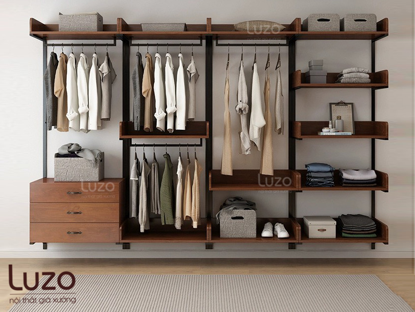 Kệ treo quần áo tại IGA được làm từ khung sắt cứng cáp, sơn tĩnh điện 100% và hộc tủ bằng gỗ MDF phủ melamine, không chỉ đẹp mắt mà còn đảm bảo độ bền. Sản phẩm không chỉ giúp tiết kiệm không gian mà còn làm cho căn phòng ngủ trở nên sang trọng và hiện đại hơn.