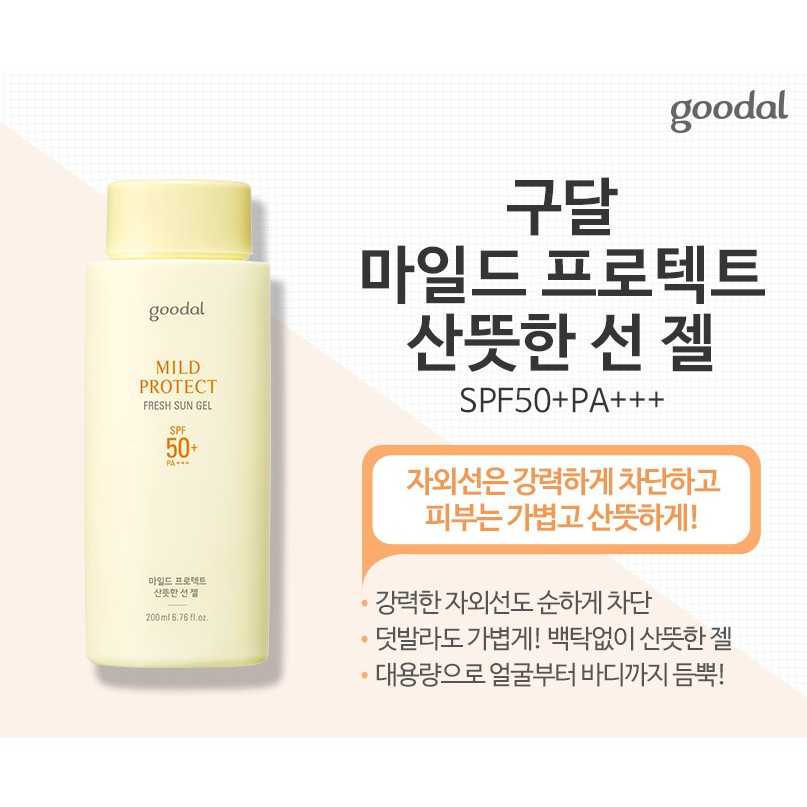 Kem chống nắng Goodal Mild Protect Fresh Sun Gel nổi bật với thành phần chính là chiết xuất xương rồng, mang lại hiệu quả bảo vệ da tối ưu. Với chỉ số chống nắng SPF 50+ và PA++++, sản phẩm này giúp bảo vệ da khỏi tác hại của tia UVB và UVA, đồng thời chống ánh sáng xanh.