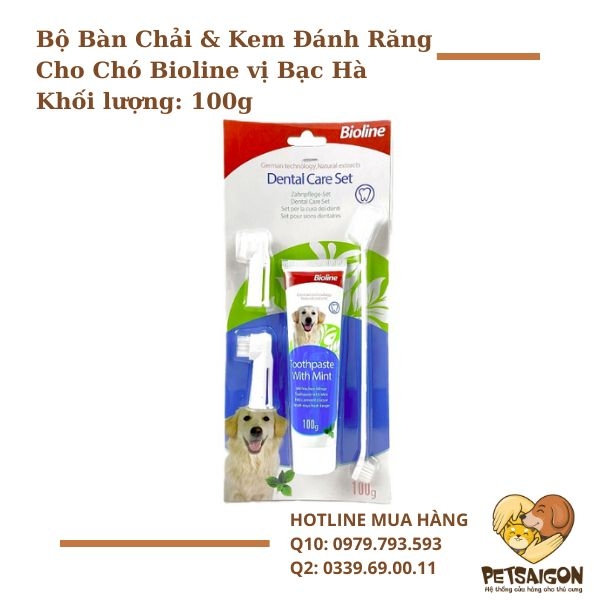 Nếu muốn bộ đầy đủ, Bioline Dental Care Set là lựa chọn tuyệt vời khác. Bao gồm kem đánh răng và bàn chải chuyên dụng, làm sạch cặn thức ăn, bảo vệ nướu khỏe mạnh. Giá chỉ từ 99.000đ, dễ mua trên Chiaki hay Pet Hyatt.