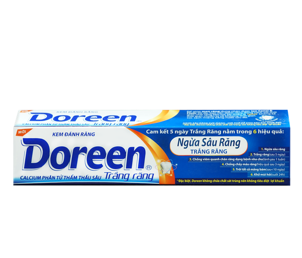 Kem đánh răng Doreen cam kết mang lại hiệu quả vượt trội chỉ sau 5 ngày sử dụng, bao gồm ngăn ngừa sâu răng, làm trắng răng và loại bỏ mảng bám. Ngoài ra, sản phẩm còn có khả năng khử mùi và cung cấp sức khỏe cho răng miệng toàn diện. Thành phần chính là Canxi và Flour giúp diệt khuẩn, làm thơm miệng và bảo vệ sức khỏe răng miệng cho cả gia đình.