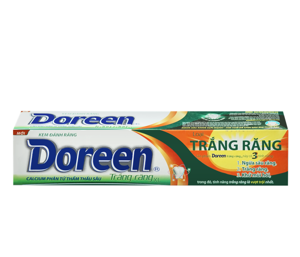 Kem đánh răng Doreen là một sản phẩm nổi bật của thương hiệu Việt Nam, được thiết kế với nhiều ưu điểm vượt trội cho sức khỏe răng miệng. Với thành phần chủ yếu là canxi và fluoride, sản phẩm không chỉ giúp làm trắng răng hiệu quả mà còn ngừa các vấn đề như nhiệt miệng và sâu răng.