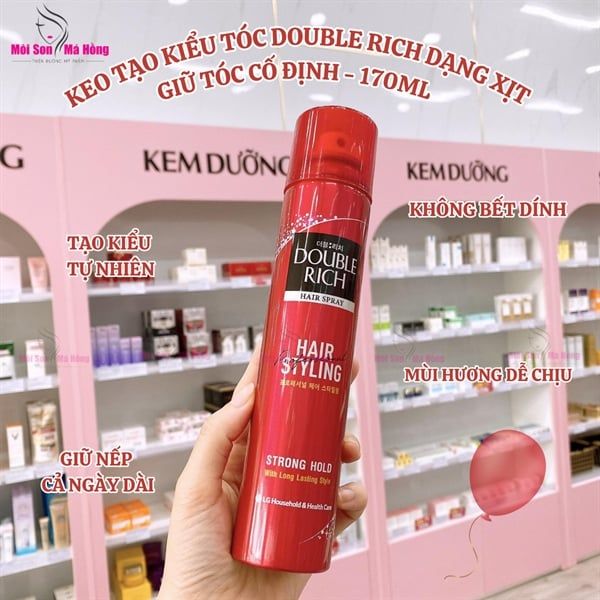 Bạn có thể mua keo Double Rich dễ dàng tại các cửa hàng mỹ phẩm lớn hoặc trên các trang thương mại điện tử. Sản phẩm có dung tích 170ml, rất phù hợp cho việc sử dụng hàng ngày. Để sử dụng hiệu quả, bạn chỉ cần giữ chai thẳng đứng cách tóc khoảng 20-30cm, xịt đều lên tóc rồi tạo kiểu theo ý muốn.