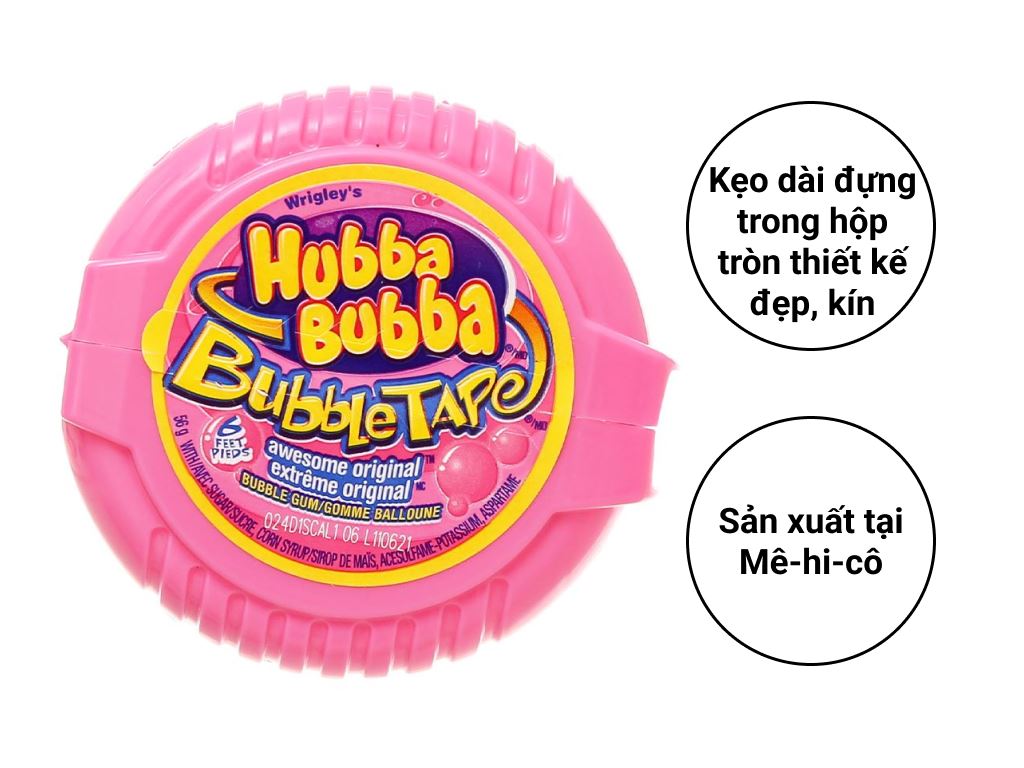 Hình dạng kẹo được thiết kế thành dải dài khoảng 180cm, cuộn tròn gọn gàng trong một chiếc hộp nhựa xinh xắn. Với hương vị phong phú như dưa hấu, trái cây hỗn hợp và bạc hà, kẹo Hubba Bubba mang đến cho bạn trải nghiệm thú vị qua từng miếng nhai. Kết cấu mềm mại của kẹo khiến cho việc thưởng thức trở nên dễ dàng hơn bao giờ hết.