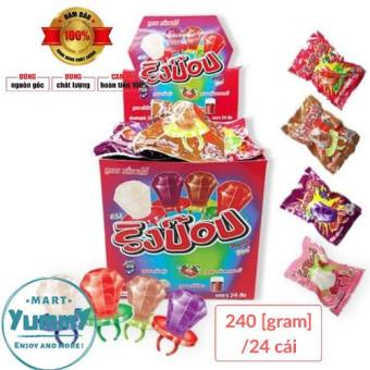 Kẹo nhẫn Diamond Pop Ring xuất xứ từ Thái Lan, với quy cách 10g x 24, mang đến sự đa dạng với 5 hương vị trái cây hấp dẫn như nho, cam, dâu, và cola. Đặc biệt, viên kẹo “kim cương” lớn được gắn vào chiếc nhẫn nhựa ABS cao cấp, vừa tiện lợi để đeo vừa thú vị khi thưởng thức.