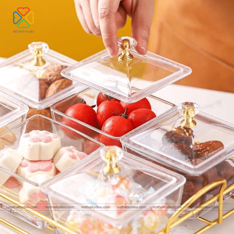 Các hũ có dung tích đa dạng như 50ml và 100ml, phù hợp để đựng mứt dâu tằm, bánh kẹo hay các loại hạt. Những sản phẩm này không chỉ có chức năng đựng mà còn là món đồ trang trí ấn tượng với vẻ ngoài bóng bẩy, thường được sáng tạo thành các khay đựng nhiều ngăn cho phép bạn dễ dàng tổ chức và sắp xếp.