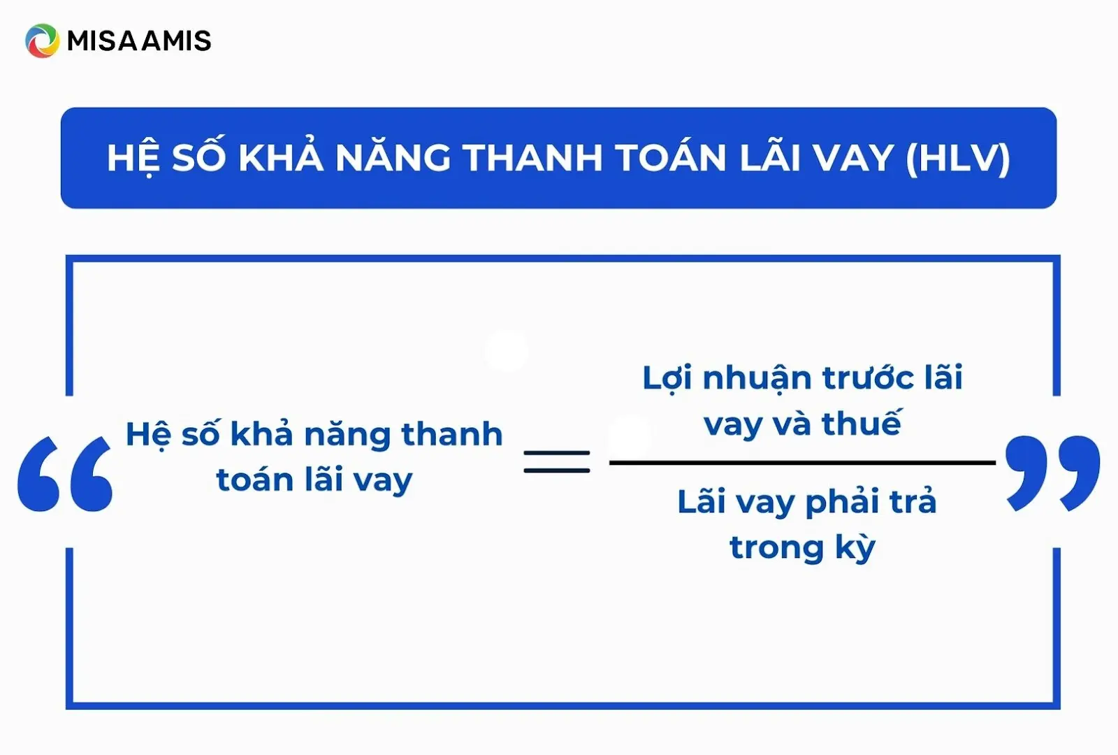 Hệ số khả năng thanh toán lãi vay (Interest coverage ratio) biểu thị doanh nghiệp dùng lợi nhuận trước thuế và lãi vay (EBIT) bao nhiêu để chi trả lãi. Công thức: EBIT / Chi phí lãi vay. Chỉ số này cho biết doanh nghiệp trả được lãi bao nhiêu lần từ lợi nhuận hoạt động.