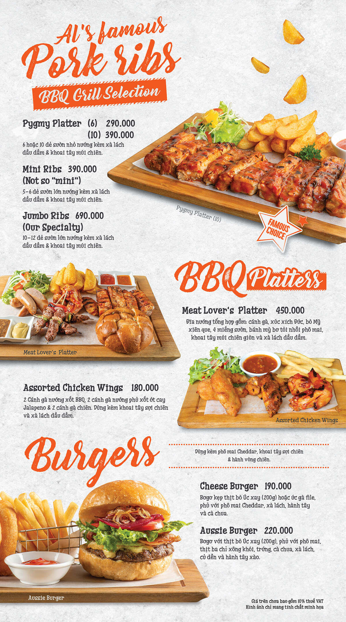 Thực đơn tại Al Fresco’s ở Aeon Mall Bình Tân mang đến sự đa dạng và phong phú với sự kết hợp hài hòa giữa các phong cách ẩm thực Úc, Á và Âu. Nhà hàng nổi tiếng với những món ăn thượng hạng như pizza, burger, mì Ý, pasta, steak, salad cùng sườn nướng. Đặc biệt, thực khách có thể trải nghiệm những món ăn hấp dẫn như BBQ ribs, Aussie steaks và các loại pizza đa dạng như BBQ Chicken, Santa Fe Beef & Cheese, Marinara. Với mức giá phải chăng, pizza tại đây dao động từ 150.000 đến 270.000 đồng tùy theo kích thước.