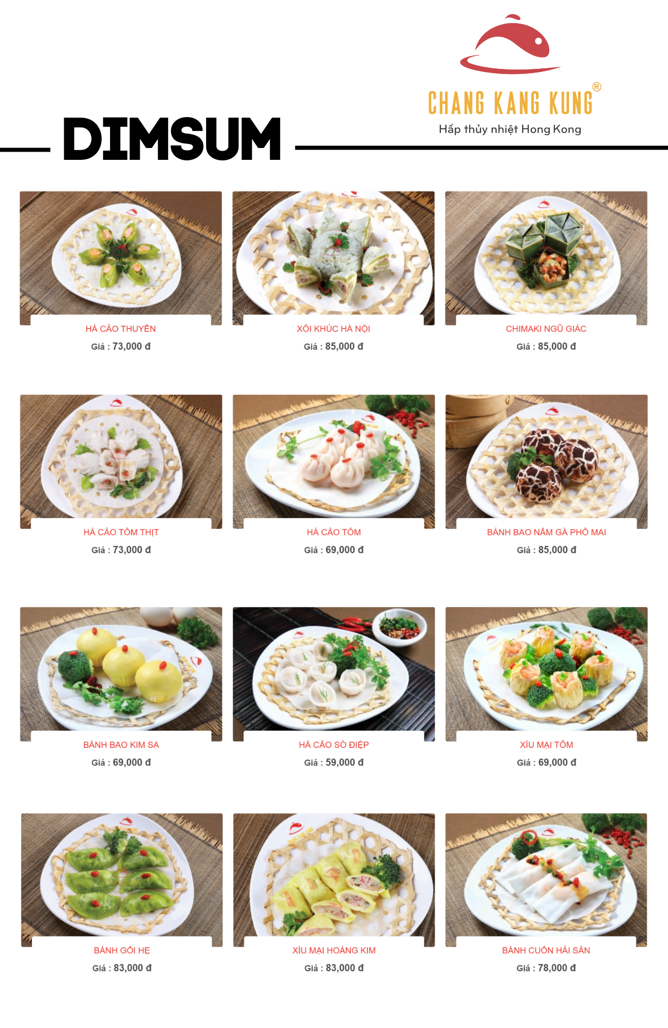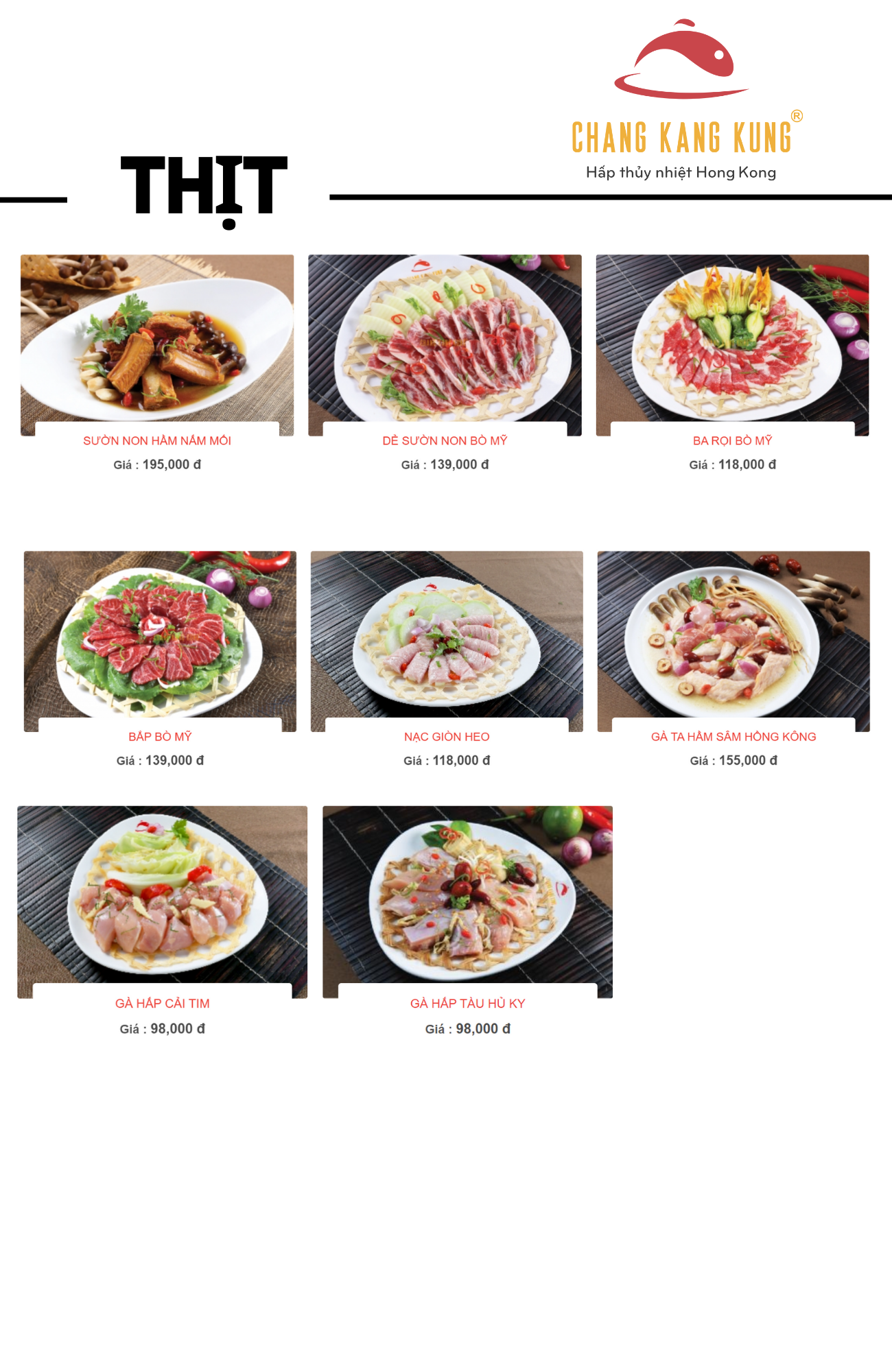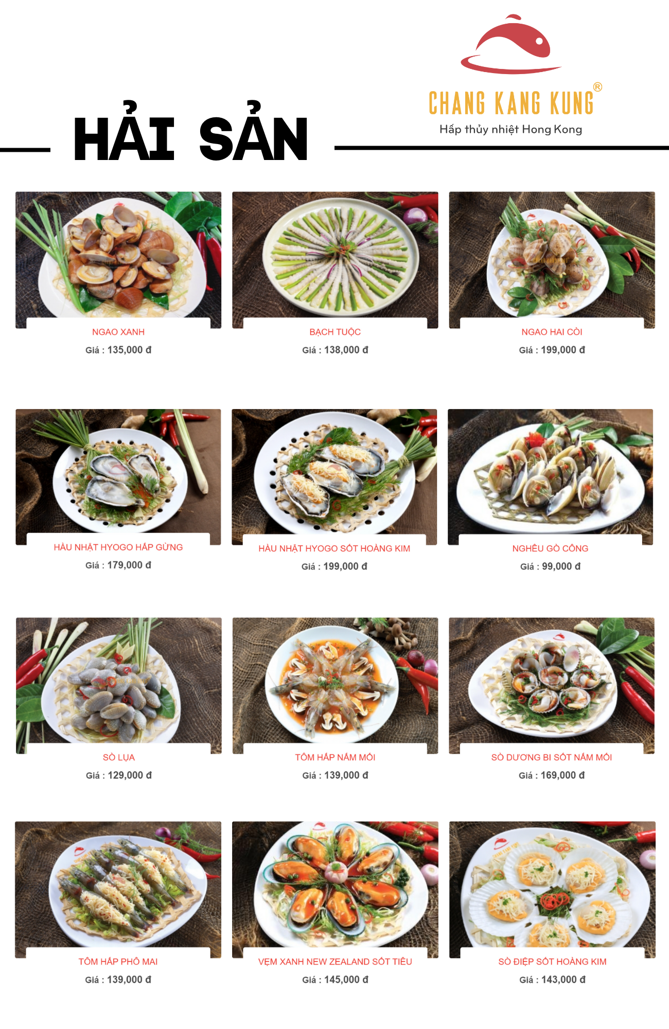 Tại nhà hàng Chang Kang Kung, thực khách sẽ được trải nghiệm một thực đơn phong phú với nhiều món ăn hấp dẫn và giá cả hợp lý. Những món cá hấp như cá mú Úc, cá chẽm và cá hồi được phục vụ với mức giá từ 125.000 đến 295.000 VNĐ. Hải sản hấp cũng không kém phần phong phú, bao gồm tôm, mực, bào ngư và cua, với giá dao động từ 99.000 đến 199.000 VNĐ.
