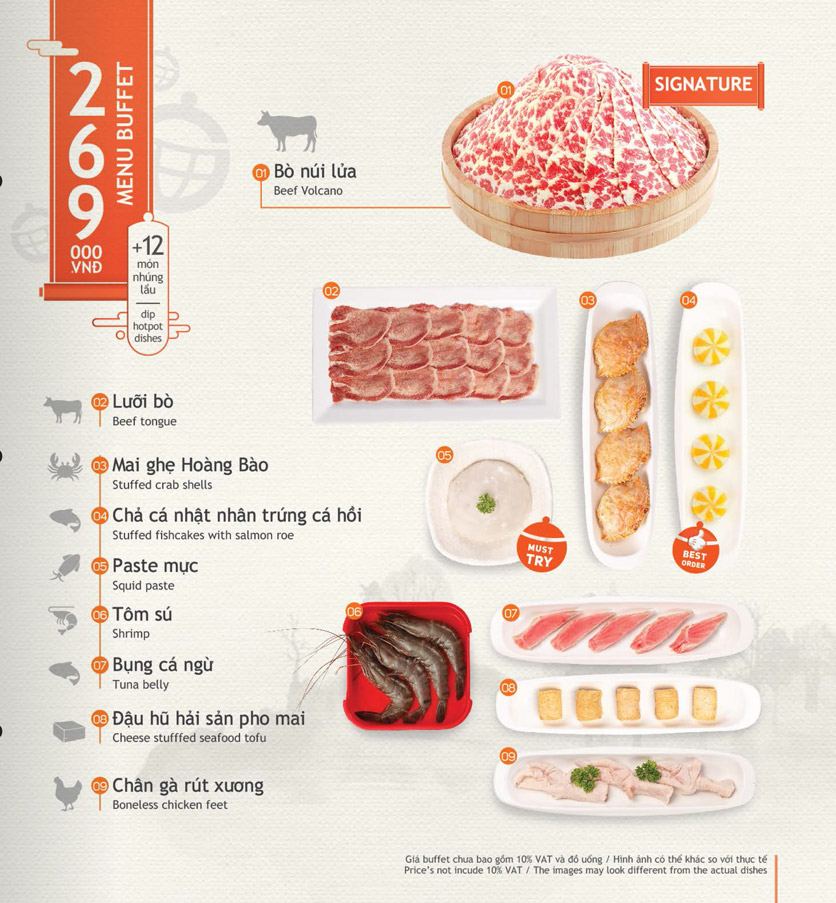 Hotpot Story là chuỗi nhà hàng buffet lẩu nổi tiếng với thực đơn đa dạng và phong phú. Tại đây, bạn sẽ có cơ hội thưởng thức những vị lẩu đặc trưng từ nhiều nền ẩm thực khác nhau như Tứ Xuyên, Tom Yum, Miso, Bulgogi và Suki. Menu buffet phong phú với nhiều combo hấp dẫn, có giá từ 199.000 đến 319.000 đồng, tùy thuộc vào số lượng món nhúng lẩu mà bạn chọn. Các combo thường bao gồm các món như gà phile, chả cá Nhật, ngao trắng cùng nhiều loại thịt cao cấp khác.