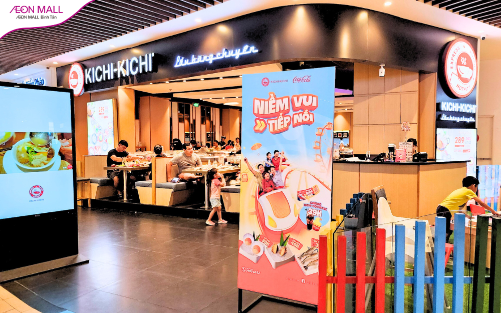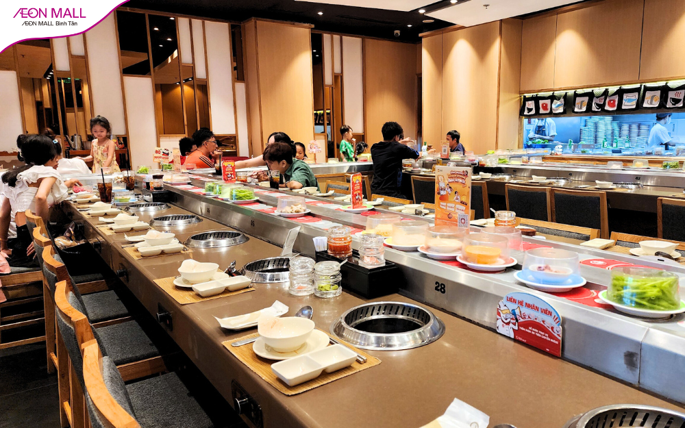 Kichi Kichi tại Aeon Mall Bình Tân là điểm đến lý tưởng cho những tín đồ yêu thích lẩu băng chuyền. Tọa lạc trên tầng 3 của trung tâm thương mại, nhà hàng sở hữu không gian hiện đại và sang trọng với tông màu đen đặc trưng. Thiết kế đơn giản nhưng tinh tế mang lại cảm giác thoáng đãng và lịch sự cho thực khách.