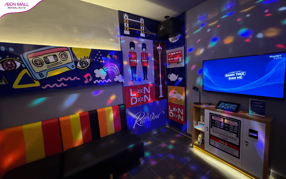 Tại AEON Mall Bình Tân, dịch vụ phòng hát karaoke mang đến trải nghiệm giải trí thú vị với mô hình Rainbow Noraebang, lần đầu tiên có mặt tại Việt Nam. Không gian sôi động và hiện đại, được thiết kế đầy màu sắc, là nơi lý tưởng cho những buổi gặp gỡ vui vẻ giữa bạn bè và gia đình.