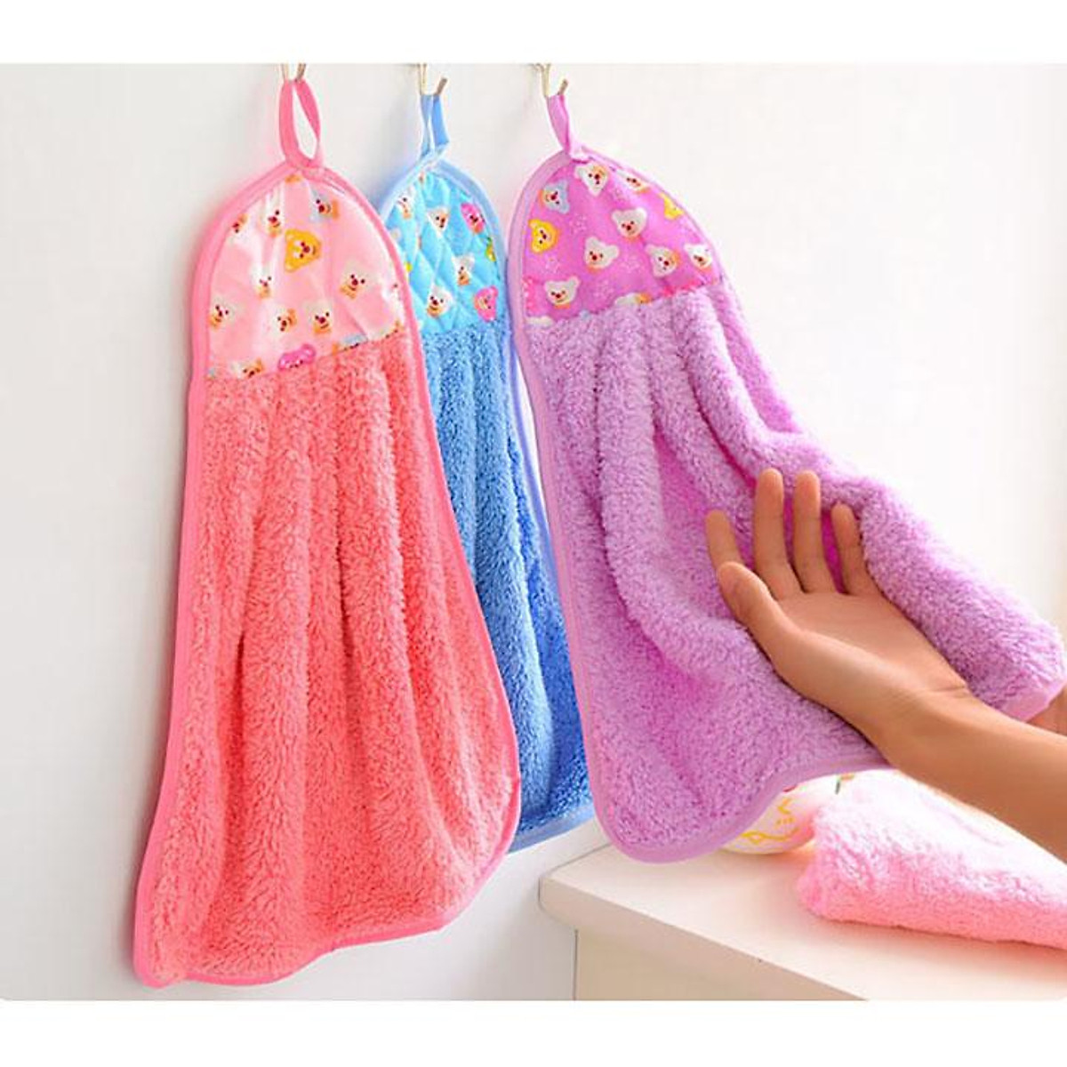 Chất liệu cotton không chỉ giúp hấp thụ nước nhanh chóng mà còn đảm bảo độ bền và an toàn cho sức khỏe khi tiếp xúc với da. Móc treo tiện lợi giúp bạn dễ dàng cất giữ khăn sau khi sử dụng, giữ cho không gian luôn gọn gàng và sạch sẽ. Thêm vào đó, khăn có nhiều màu sắc đa dạng, phù hợp với nhiều phong cách trang trí khác nhau.