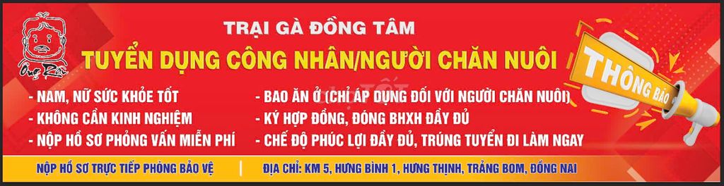 Hiện tại, chúng tôi đang cần tuyển dụng 1 nam công nhân cho trại gà thịt tại Xuân Lộc, Đồng Nai. Nếu bạn trong độ tuổi từ 35 đến 40 và đang tìm kiếm một công việc ổn định, đây sẽ là cơ hội tốt cho bạn. Mức lương hấp dẫn 10 triệu đồng một tháng cùng với chế độ ăn ở miễn phí, bao điện nước, chắc chắn sẽ giúp bạn an tâm hơn trong cuộc sống.