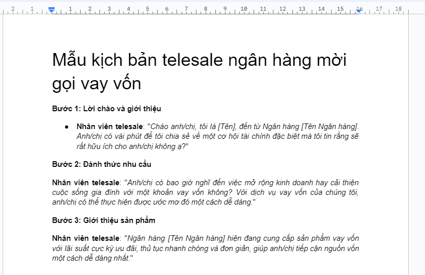 Một kịch bản telesale tài chính thường bắt đầu bằng phần giới thiệu ngắn gọn, thân thiện để tạo thiện cảm, sau đó là phần tư vấn giải pháp phù hợp với nhu cầu tài chính của khách hàng. Việc này giúp khách hàng cảm thấy được lắng nghe và quan tâm đúng mức, từ đó dễ dàng mở lòng chia sẻ về tình hình tài chính hiện tại.