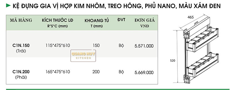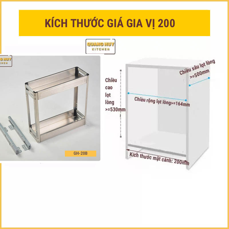 Ví dụ, kệ gia vị 150mm có chiều rộng cửa tủ 160mm và chiều sâu 475mm, giúp tiết kiệm diện tích nhưng vẫn đảm bảo khả năng chứa đựng đủ cho các chai lọ gia vị. Còn với kệ 200mm và 250mm, chúng có chiều rộng lần lượt là 400mm và 500mm, đáp ứng nhu cầu tổ chức nhiều loại gia vị cùng lúc.
