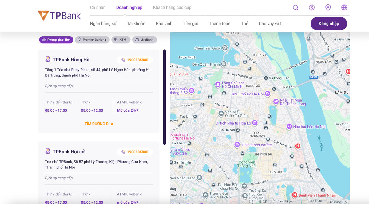 Nếu bạn đang tìm kiếm một địa điểm giao dịch gần nhất, chỉ cần truy cập vào website của TPBank và nhập vị trí của mình, hệ thống sẽ ngay lập tức hiển thị danh sách các chi nhánh, phòng giao dịch và ATM gần nhất, giúp tiết kiệm thời gian và công sức cho bạn.