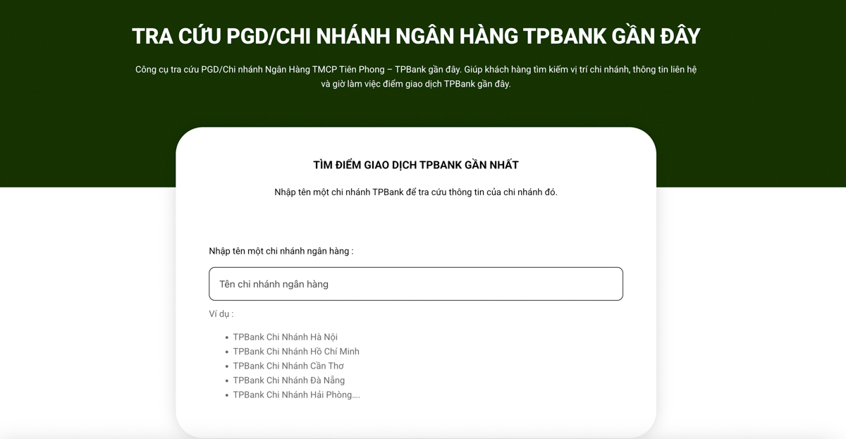 Nếu bạn đang tìm kiếm địa chỉ chi nhánh TPBank gần nhất, hãy thử công cụ tra cứu địa chỉ của ngân hàng. Bạn chỉ cần nhập thông tin về khu vực bạn đang sống và hệ thống sẽ cung cấp cho bạn danh sách các chi nhánh cùng với thông tin liên hệ và giờ làm việc.