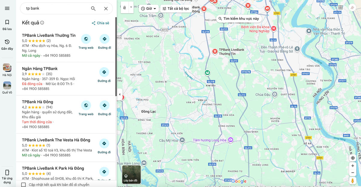 Ngoài ra, bạn cũng có thể tìm thấy các chi nhánh TPBank trên Google Maps bằng cách gõ từ khóa “TPBank” hoặc “phòng giao dịch TPBank”. Các điểm giao dịch đều nằm ở những khu vực đông dân cư, giúp bạn dễ dàng tìm kiếm. Đừng quên mang theo CCCD hoặc CMND nếu bạn đến quầy giao dịch để tra cứu nhé!