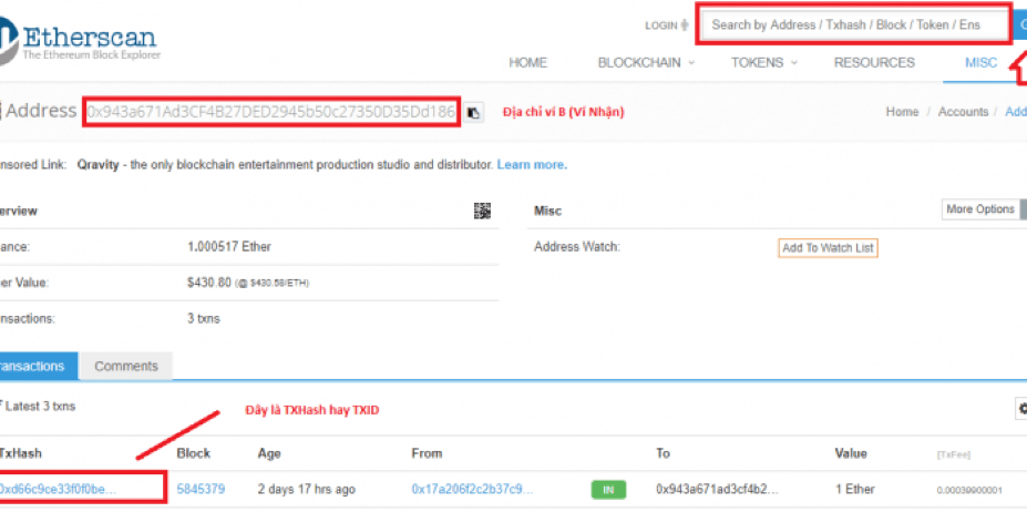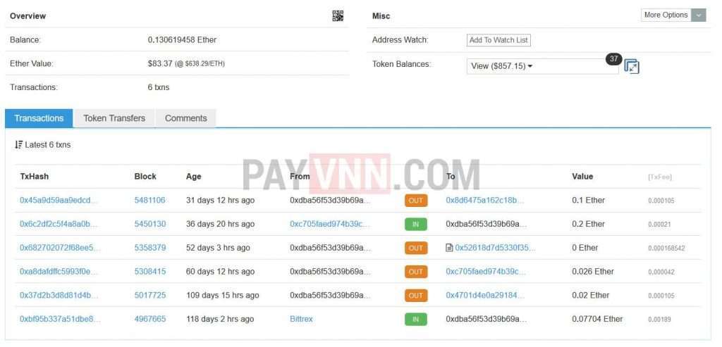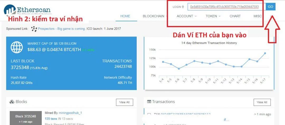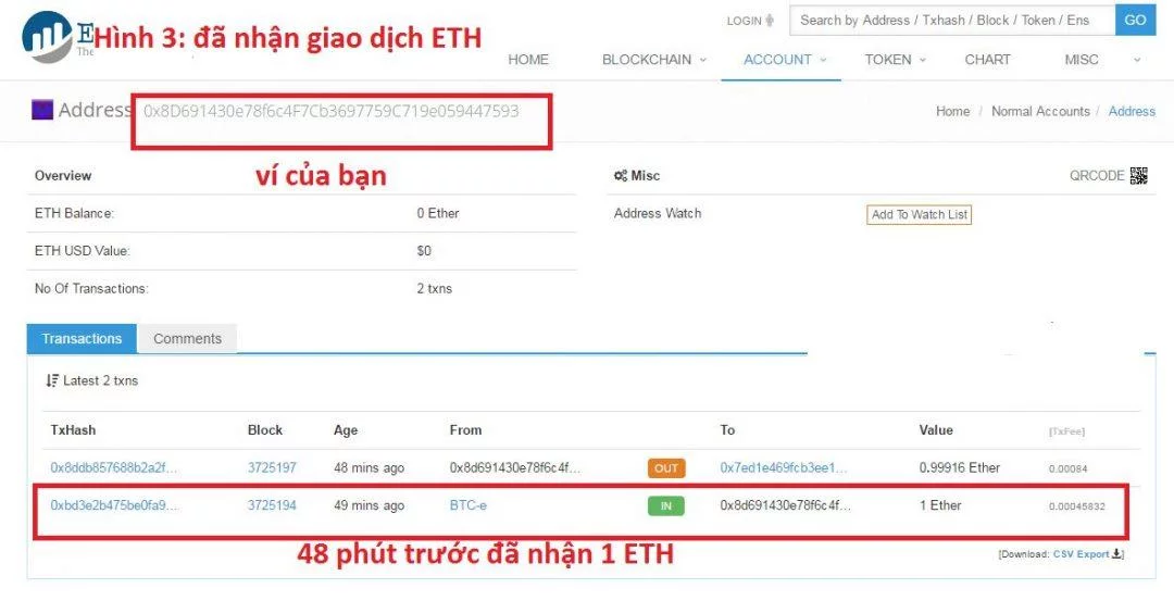 Khi muốn kiểm tra giao dịch ETH, bạn có thể sử dụng công cụ rất phổ biến là Etherscan – một trang web chuyên tra cứu các giao dịch trên mạng lưới Ethereum. Việc kiểm tra rất đơn giản, bạn chỉ cần lấy địa chỉ ví Ethereum hoặc mã giao dịch (Txn Hash) rồi nhập vào thanh tìm kiếm trên Etherscan.io. Ngay lập tức, bạn sẽ thấy được số dư hiện tại của ví, các token đang có, cũng như danh sách chi tiết các giao dịch đã thực hiện, bao gồm thời gian, số lượng ETH chuyển đi hoặc nhận về, địa chỉ người gửi và người nhận, cùng phí giao dịch.