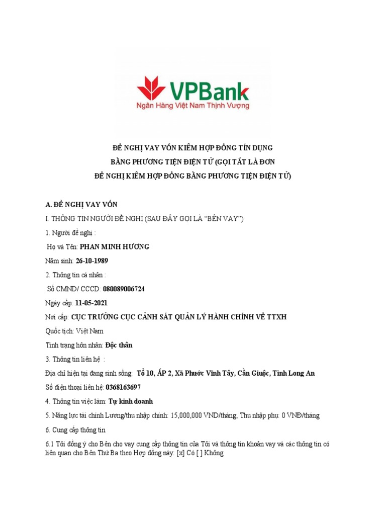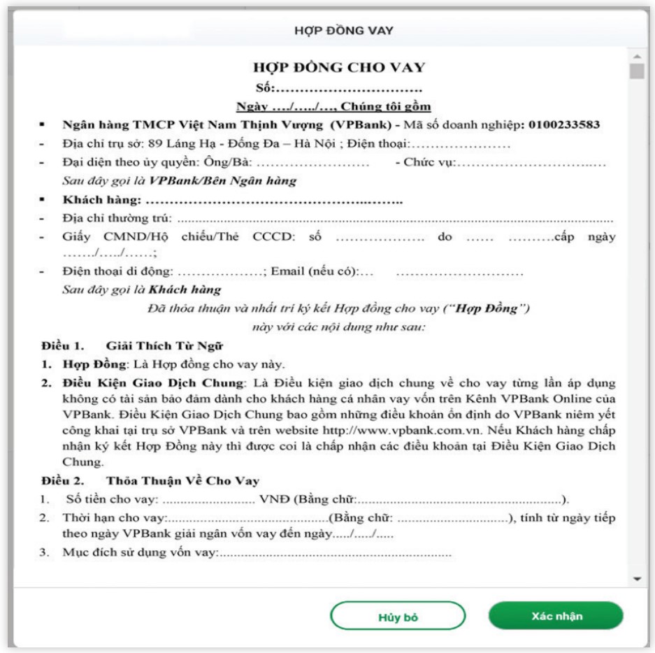 Hợp đồng vay tín chấp tại Ngân hàng TMCP Việt Nam Thịnh Vượng (VPBank) là một giải pháp tài chính nhanh chóng và tiện lợi cho những ai đang cần tiền mà không có tài sản thế chấp. Bạn chỉ cần có chứng minh thư, căn cước công dân hoặc hộ chiếu còn hiệu lực, cùng với sổ hộ khẩu hoặc giấy phép lái xe là đã có thể đăng ký vay. Hạn mức vay lên đến 400 triệu đồng với lãi suất ưu đãi.