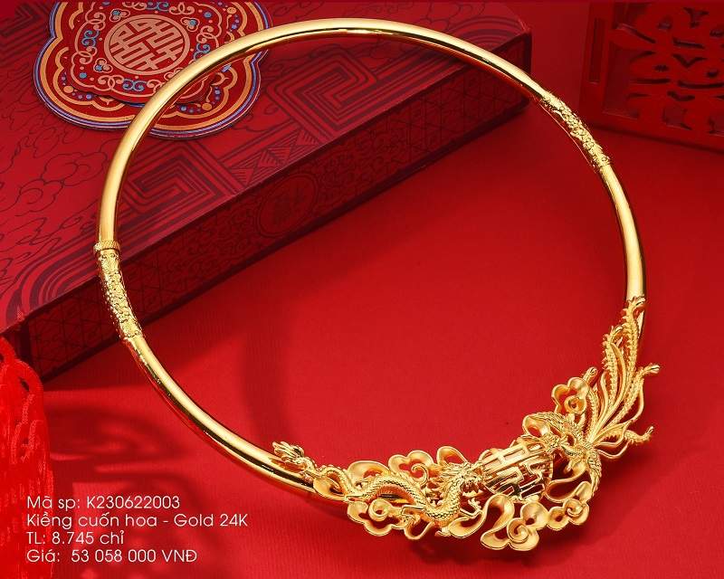 Kiềng vàng 3 chỉ 9999 là món trang sức biểu tượng cho sự giàu có và đẳng cấp, được nhiều khách hàng ưa chuộng nhờ chất liệu vàng nguyên chất và thiết kế tinh xảo. Các mẫu kiềng truyền thống thường có họa tiết hoa văn như hoa mai, hoa đào, rồng, phượng, mang ý nghĩa phong thủy và giá trị tinh thần sâu sắc, phù hợp với những người yêu thích vẻ đẹp cổ điển và trang trọng.