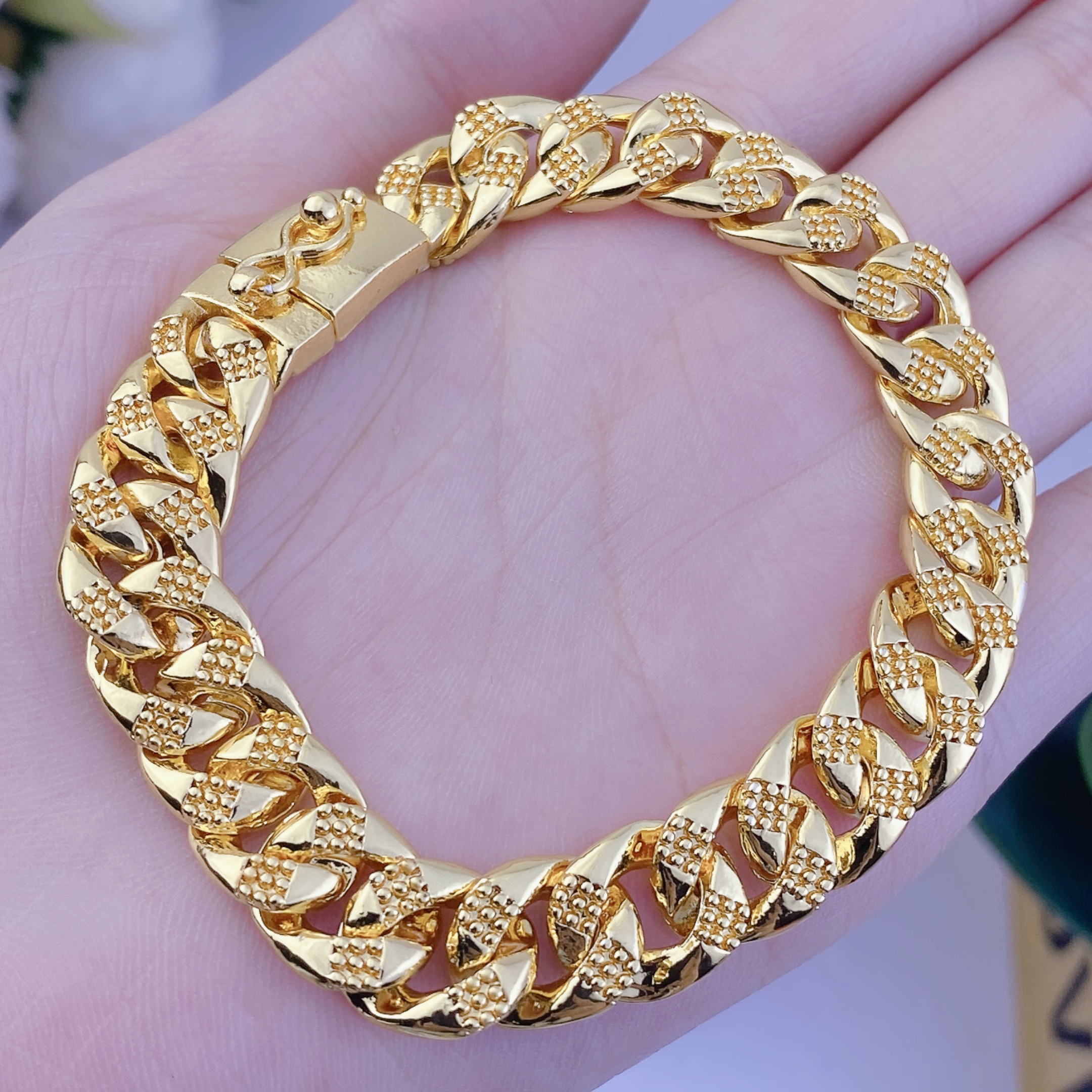 Điều đặc biệt của lắc tay vàng 18K bản to là sự tinh xảo trong từng chi tiết, được chế tác tỉ mỉ trên dây chuyền công nghệ hiện đại, thậm chí nhiều sản phẩm còn được nhập khẩu nguyên chiếc từ Italy – cái nôi của ngành trang sức cao cấp. Ngoài ra, một số mẫu còn kết hợp đá kim cương nhân tạo, làm tăng thêm vẻ sang trọng và đẳng cấp. Đây không chỉ là món phụ kiện thời trang mà còn là cách để phái mạnh thể hiện cá tính và sự trân trọng bản thân một cách tinh tế nhất. Đầu tư vào một chiếc lắc tay vàng 18K bản to chính là cách để bạn nâng tầm phong cách và giữ giá trị lâu dài theo thời gian.