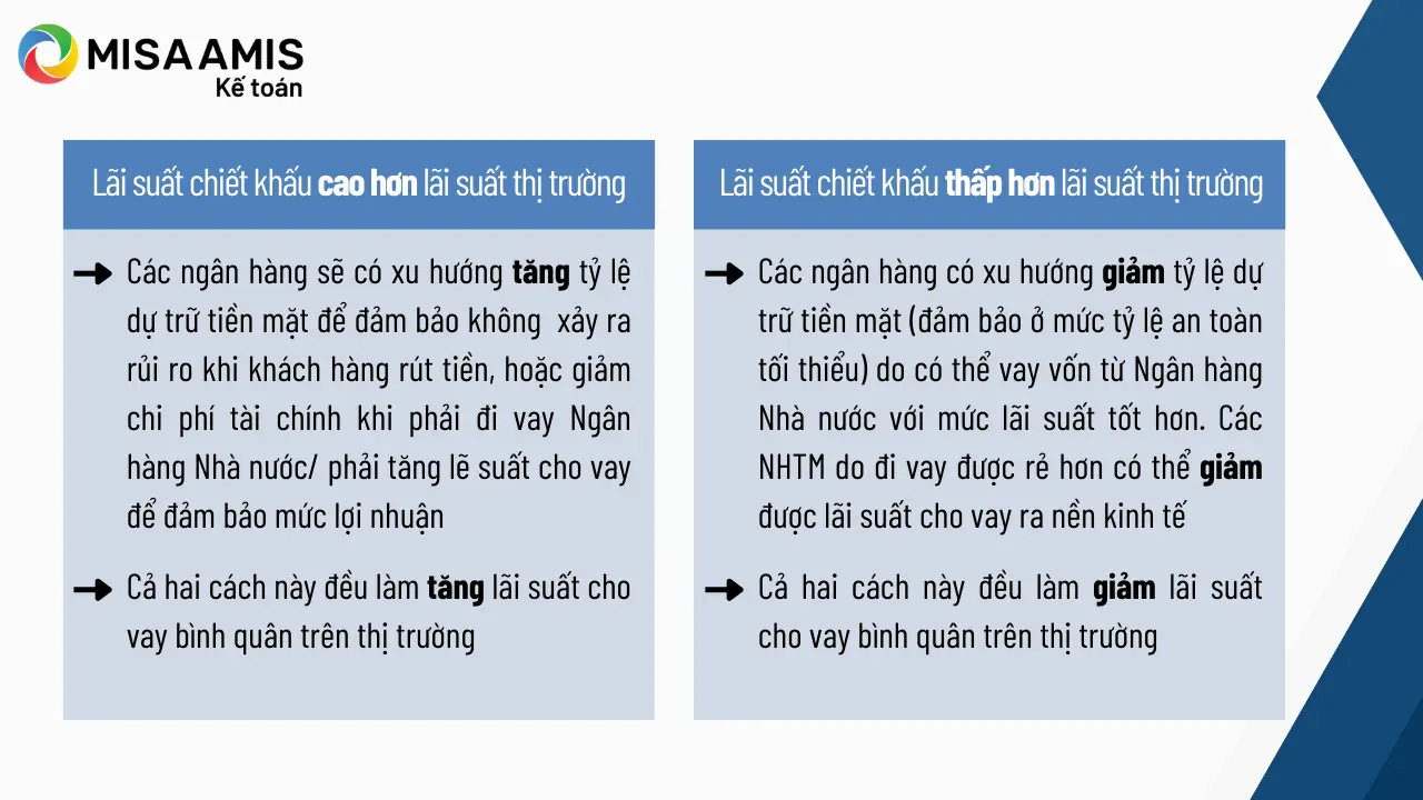 Khi ngân hàng thương mại vay với lãi suất chiết khấu, điều này giúp NHTW kiểm soát lượng tiền cung ứng trong nền kinh tế. Nếu muốn tăng cường cung tiền, NHTW có thể điều chỉnh lãi suất chiết khấu xuống, tạo điều kiện cho các ngân hàng dễ dàng tiếp cận vốn hơn.