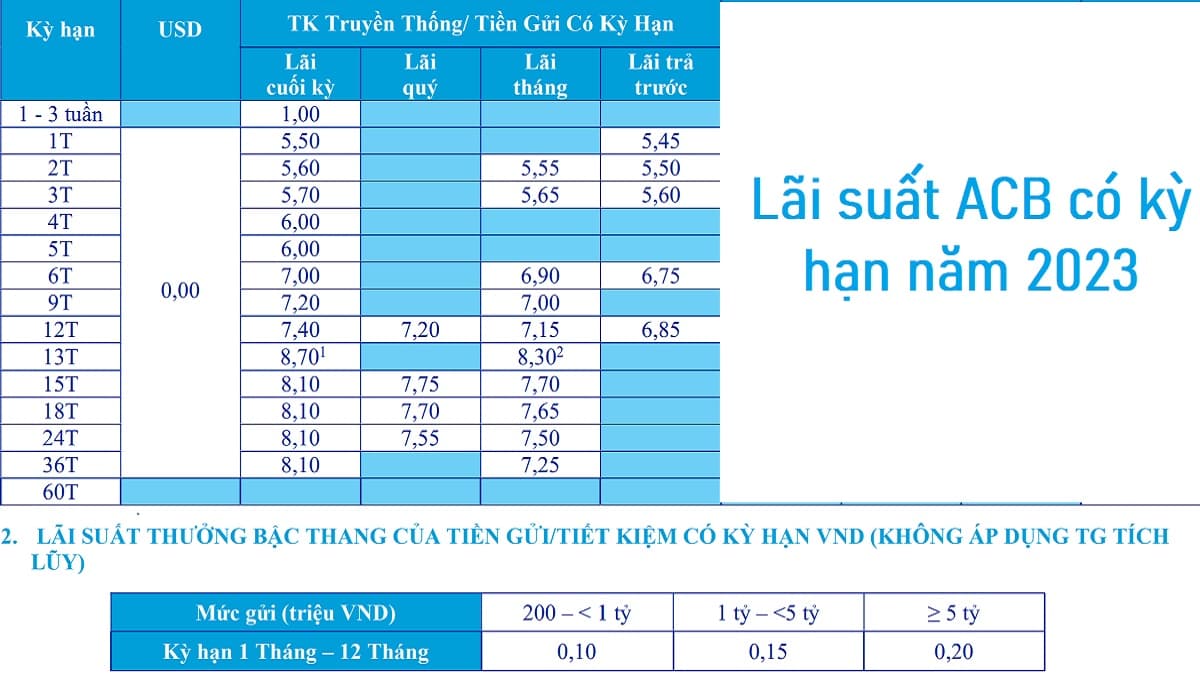 Đối với lãi suất tiền gửi tiết kiệm, ACB cũng có những mức lãi suất hấp dẫn. Hiện tại, lãi suất dao động từ 2.3% đến 5%/năm. Cụ thể, cho kỳ hạn gửi từ 1-3 tuần, lãi suất là 0,5%/năm; và kỳ hạn 1 tháng đạt 2,3%/năm. Thông tin này thật sự hữu ích nếu bạn đang có ý định đầu tư tiết kiệm.