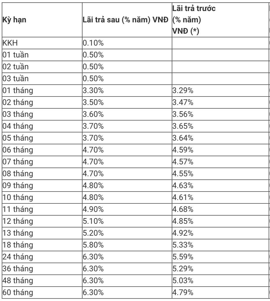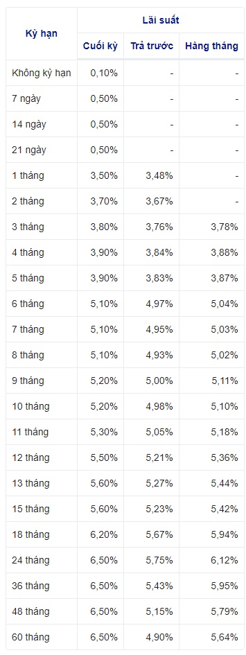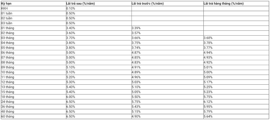Ngoài ra, lãi suất cho các kỳ hạn ngắn hơn cũng được công bố rõ ràng. Cụ thể, lãi suất cho kỳ hạn một tháng là 2,5%, kỳ hạn hai tháng là 2,7%, và kỳ hạn ba tháng là 2,8%. Đối với các kỳ hạn dài hơn, như 12 tháng, lãi suất là 4,7%.