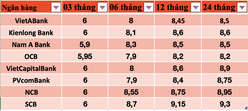 Ngoài VIB, một số ngân hàng khác cũng thực hiện điều chỉnh lãi suất. Ngân hàng CBBank giữ nguyên mức lãi suất cho các kỳ hạn ngắn hạn nhưng giảm lãi suất ở các kỳ hạn trung hạn, đặc biệt là kỳ hạn 6 tháng từ 5,6% giảm xuống 5%. SCB đã thực hiện giảm lãi suất cho tất cả các kỳ hạn, trong đó kỳ hạn 6 tháng giảm từ 5,35% còn 4,95%. Đối với PVcomBank và Sacombank, mức lãi suất vẫn giữ ở mức cao hơn, với lãi suất 6,2%/năm cho hình thức gửi trực tuyến.