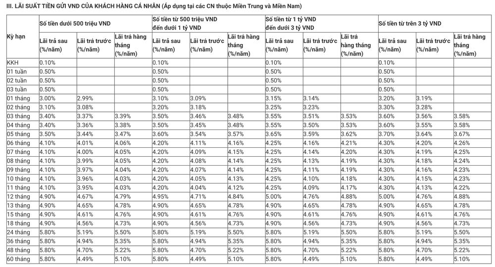 Đối với khách hàng cá nhân gửi tiền dưới 500 triệu đồng, lãi suất dao động từ 2,9% đến 5,7% mỗi năm, tùy theo kỳ hạn gửi từ 1 đến 60 tháng. Những kỳ hạn dài hơn thường áp dụng lãi suất cao hơn, đặc biệt là dành cho các kỳ hạn từ 24 tháng trở lên.