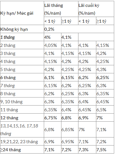 Còn đối với các tiền gửi từ 6 tháng trở lên, mức lãi suất cũng khá hấp dẫn, với các khoản lãi suất có thể lên đến 7,50%/năm. Điều này mang lại cơ hội tốt cho những ai muốn tích lũy tài sản qua hình thức gửi tiết kiệm.