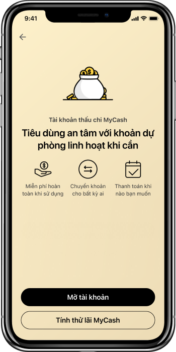 Điểm đặc biệt của sản phẩm này là bạn có thể vay mà không cần tài sản đảm bảo, với hạn mức lên đến 3 tỷ đồng và lãi suất từ 0,74%/tháng. MyCash mang lại sự linh hoạt và thuận tiện, giúp bạn quản lý tài chính hiệu quả hơn. Không cần phải chứng minh thu nhập phức tạp, bạn có thể nhận tiền ngay lập tức và hoàn toàn yên tâm với dịch vụ hỗ trợ 24/24.