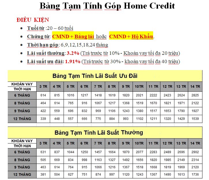 Home Credit cung cấp lãi suất trả góp linh hoạt cho khách hàng, thường dao động từ 0% đến khoảng 0,75% mỗi tháng, tương đương với 9% mỗi năm. Mức lãi suất này tùy thuộc vào từng chương trình và loại sản phẩm cho vay. Đặc biệt, trong các đợt khuyến mãi, khách hàng có cơ hội nhận lãi suất 0% khi chọn mua điện máy hoặc xe máy trả góp tại các cửa hàng liên kết.