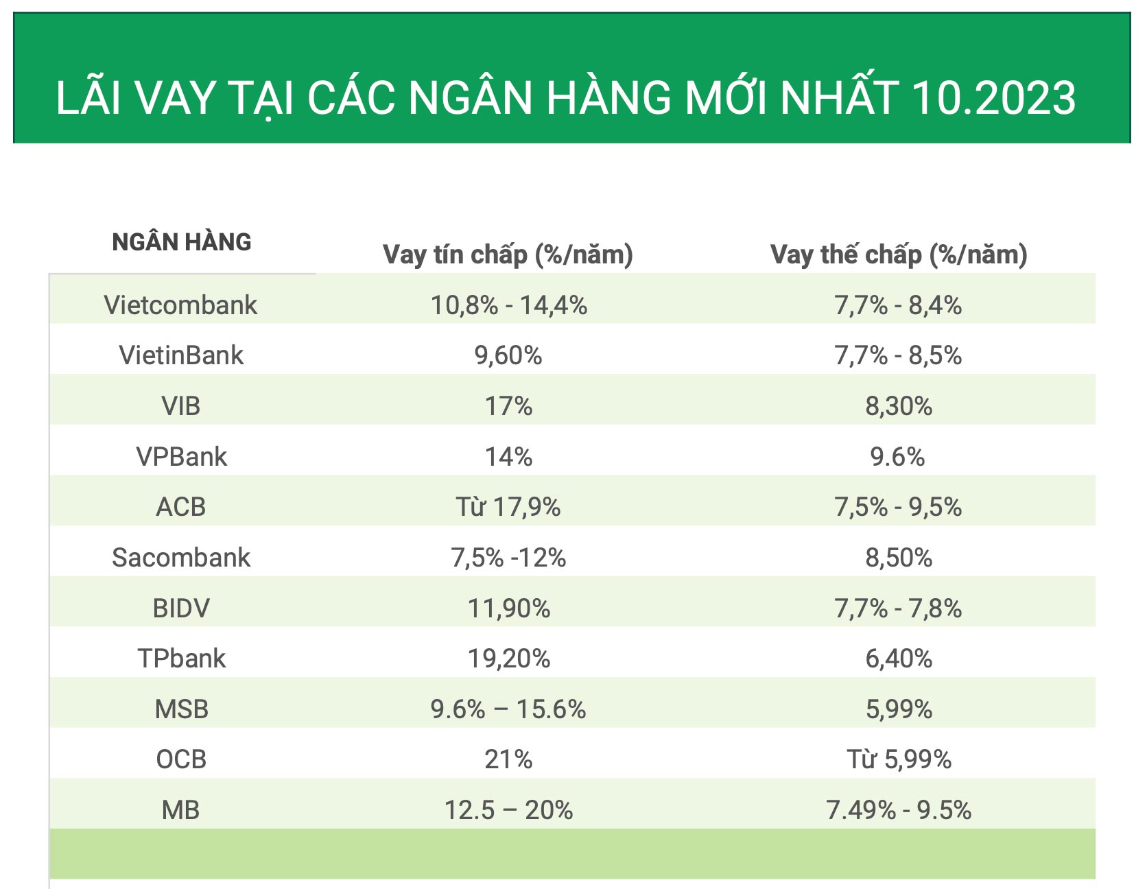 Nhiều ngân hàng có gói lãi suất ưu đãi cho vay kinh doanh: Vietcombank từ 4,6%/năm cho sản xuất kinh doanh; một vài nơi như BIDV có gói từ 3,9%/năm. Vay ngắn hạn thường từ 5,2%/năm (VND) hoặc 4,0%/năm (USD); vay trung dài hạn có thể bắt đầu từ khoảng 8%/năm.