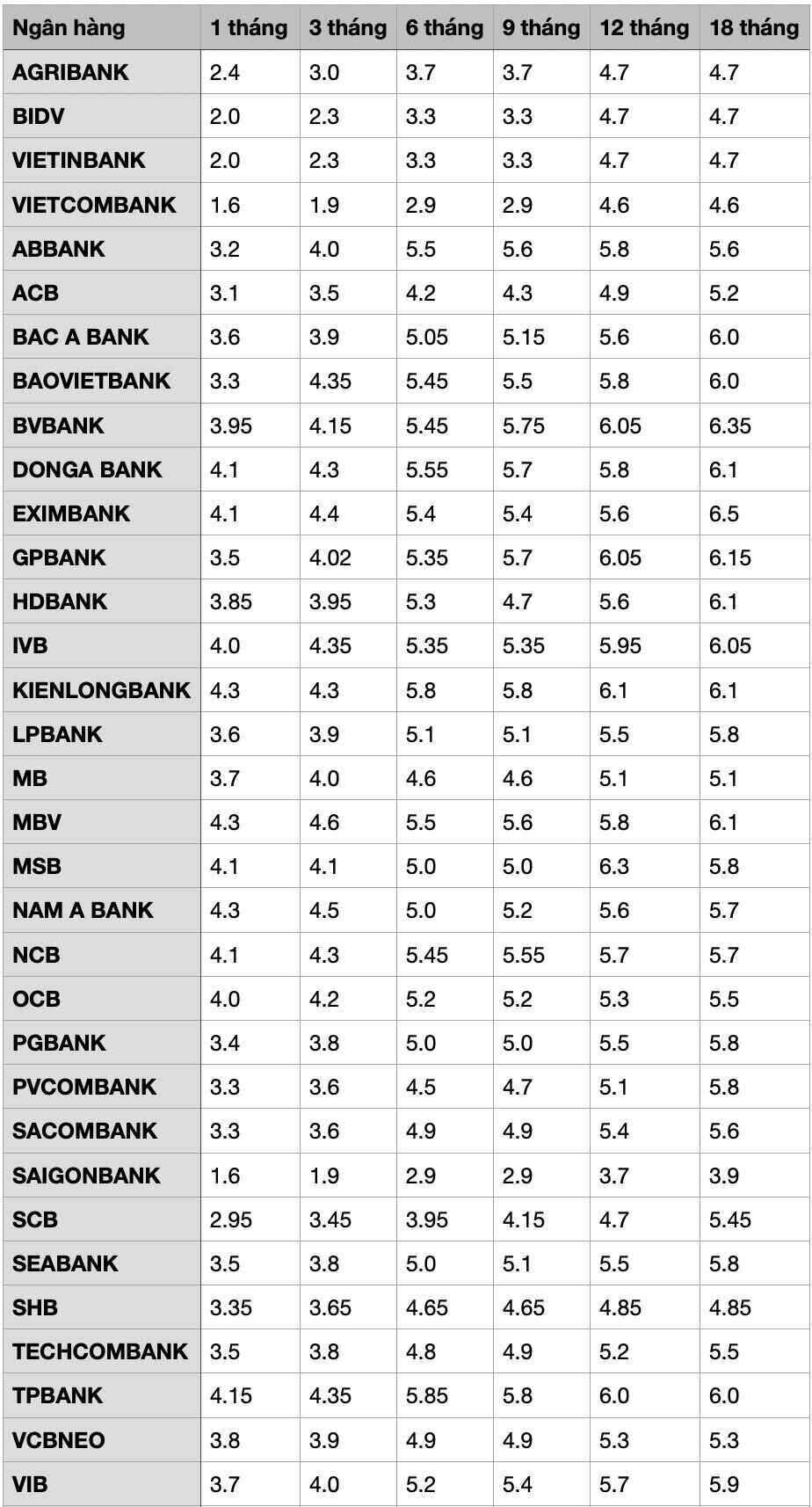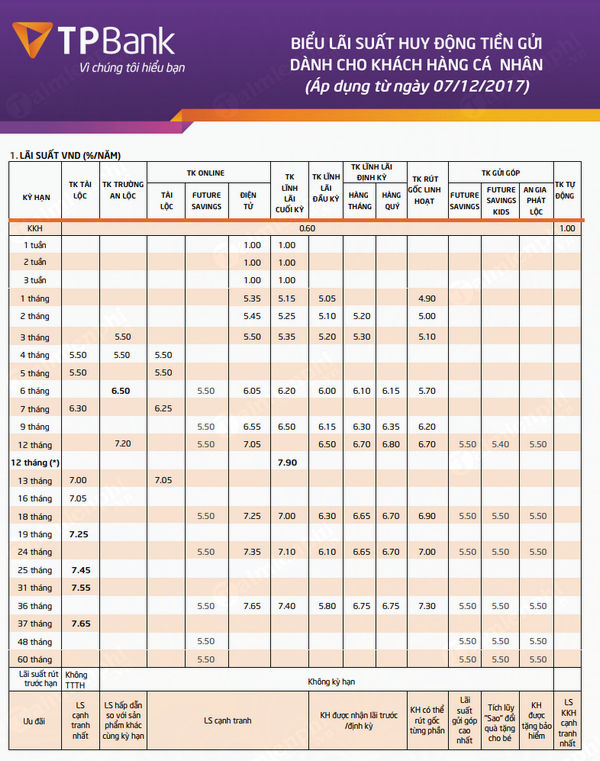Hiện tại, lãi suất tiền gửi dành cho khách hàng cá nhân tại TPBank đang ở mức khá hấp dẫn. Đối với các kỳ hạn ngắn như 3 tháng, lãi suất là 4.75%, trong khi đó, gửi tiết kiệm 6 tháng mang lại 5.10%. Đặc biệt, với kỳ hạn 12 tháng, mức lãi suất có thể lên đến 5.50%, cho thấy rõ ràng cam kết của TPBank về lợi ích cho người gửi.