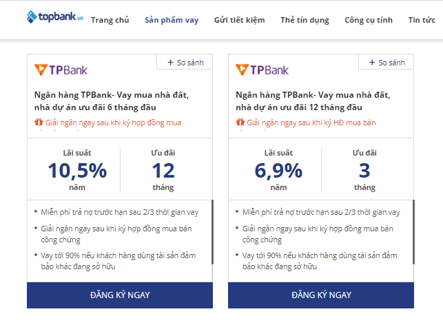 TPBank hiện cung cấp nhiều sản phẩm vay với lãi suất hấp dẫn. Chẳng hạn, mức lãi suất ưu đãi chỉ từ 8.5%/năm, giúp bạn tiết kiệm chi phí đáng kể. Khoản vay có thể lên tới 80%, với thời hạn vay linh hoạt lên đến 96 tháng, tạo điều kiện thuận lợi cho cả những ai mới bắt đầu hoặc đang tìm kiếm một giải pháp tài chính ổn định.
