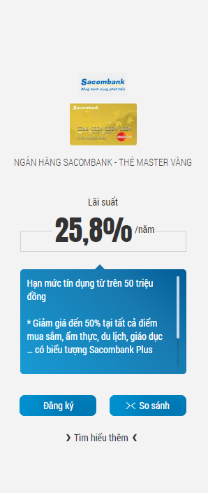 Lãi suất thẻ tín dụng Sacombank hiện dao động từ 1,6% đến 2,6% mỗi tháng, tùy thuộc vào loại thẻ. Các thẻ quốc tế như Visa Classic, Signature hay Platinum cũng có nhiều ưu đãi cho người dùng. Hạn mức tín dụng cho những chiếc thẻ này thường rất linh hoạt, từ 10 triệu VND và lên đến không giới hạn.