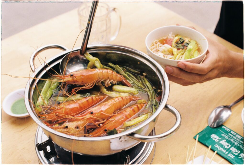 Lẩu tôm 5 Ri Biên Hòa nổi bật với món lẩu tôm càng xanh cỡ lớn, thịt chắc, tươi và ngọt. Nước lẩu có vị chua thanh nhẹ, đậm đà nhưng không quá cay, tạo nên hương vị đặc trưng khó quên. Rau ăn kèm được trụng ngay trong nồi gồm bạc hà (dọc mùng), đậu bắp, cà chua, ngò om, giúp tăng thêm độ tươi ngon và cân bằng vị giác khi thưởng thức.